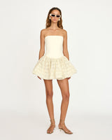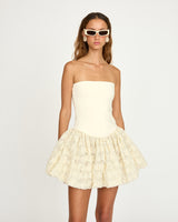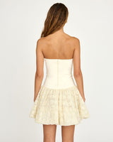 Our Carlota Dress is a strapless mini dress that combines a sleek, fitted bodice with a full floral-textured skirt. The clean design of the top contrasts with the soft, gathered skirt, creating a balanced and flattering silhouette.