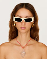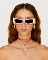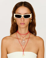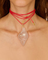 Your next “OOO” piece. Our Laria wrap is a hand-carved resin pendant adorned with cubic zirconia on an adjustable red waxed cord with 18k gold plated end caps. As versatile as it is eye-catching it can be worn long, short, or wrapped.