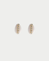 Our Wren earrings are crafted from natural cowrie shells, each inlaid with a vertical row of bezel-set cubic zirconia. Refined but playful—easy to dress up, or throw on with a swimsuit and salty hair.
