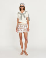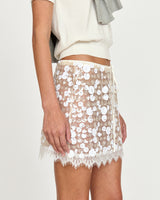 The Celia Mini Skirt features a semi-sheer sequin fabric finished with scalloped lace. An elastic waistband with a delicate drawstring ensures a comfortable, adjustable fit.