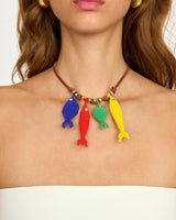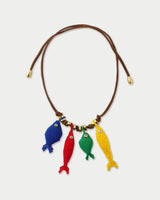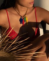 A necklace that feels like a memory of market stalls and days spent by the water. Strung with four beaded fish charms in bold primary colors, each pendant is handmade by artisans in the Colombian Amazon using traditional techniques passed down through generations. Finished with gold-plated details on a suede cord, every piece is assembled by hand in our Miami studio.