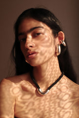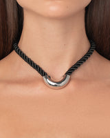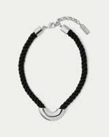 A heavily silver plated pendant on a braided silk cord. Featuring an extension chain, it seamlessly transitions from a sleek choker-style fit to a stylish, collarbone length necklace.