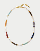 Our Carter necklace is composed of freshwater pearls, gold plated rondelles, and a mix of Tiger Eye, Aventurine, Amethyst, Lapis, Red Jasper and Yellow Jade chakra beads. Each necklace is hand strung by our team of female assemblers