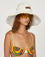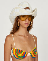 Our Vaquiero crochet hat has two side grommets so that you can securely snap the brim up for a cowboy look, or wear it brim down for an exaggerated bucket hat feel. This dual hat design is inspired by Duda's profound love for cowboy hats and Cristy's soft spot for an untraditional bucket hat.