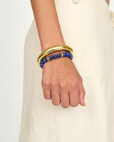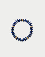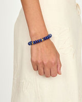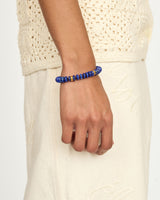 Hand-strung in Miami by our team of female artisans, our Sadie bracelet is composed of deep lapis lazuli discs, and accented with glass seed beads and finished with gold plated rondelles.