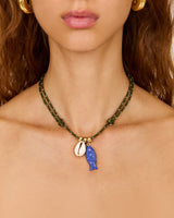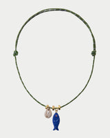 A spirited and special piece to love all summer long. Our Ollie necklace features a hand carved man-made Lapis Lazuli fish pendant, a natural cowrie shell and 18k gold plated rondelles on a paracord necklace. Can be worn long or short depending on where you adjust the paracord necklace.