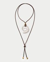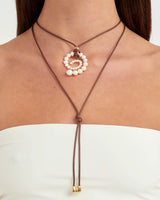 Our Arla Wrap is hand-crafted in our Miami studio by our team of female assemblers and it's focus is spiral freshwater pearl pendant which hangs from a self-tie cord that can be worn long, short, or wrapped.