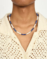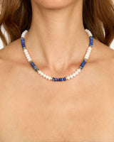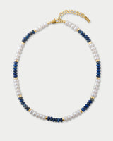 Hand-strung in Miami by our team of female artisans, the Carter necklace combines freshwater pearls with lapis lazuli beads and gold-plated rondelles. A play on balance and contrast, it’s designed to wear solo or layered into your everyday éliou stack.