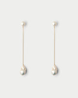 The Celesta Earrings are elegance and modernism in a single pair of earrings. A simple pearl earring turns into something more with the addition of a dainty gold plated chain hanging a freshwater baroque pearl just below the jawline.