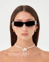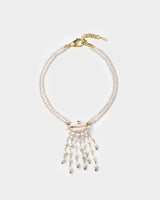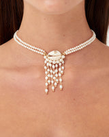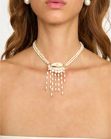 Two strings of freshwater pearls meet a delicately hand-wired cowrie shells pendant. Each organic shell is hand selected and finished with a hand drilled cubic zirconia cabochon and pearls artfully cascading outward. Whether or not you live near the beach, these earrings will teleport you sea-side every time you wear them.