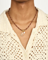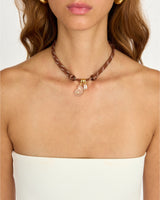 Playful and unexpected, the Nautilus necklace features a brown paracord with adjustable knots, adorned with a hand-molded resin nautilus shell charm and a tiny embedded faceted cubic zirconia. Wear it long or short — depending on where you adjust the cord.