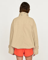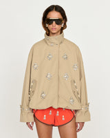 An oversized silhouette elevated with Éliou’s signature hand embellishments. The Khai Jacket features a semi-structured shape, high collar, oversized sleeves, and adjustable cuffs. Each appliqué placement was hand-marked by Zezeca, one of our co-founder’s aunts, while every cowrie shell was hand-embroidered by Vera, another aunt within our family.