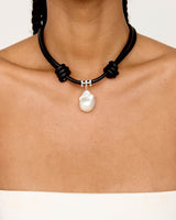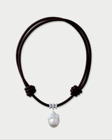 Our Kalani necklace is a freshwater pearl pendant on a leather cord with adjustable knots. This necklace can be effortlessly styled as a choker or worn longer, providing versatility to complement any outfit or occasion.