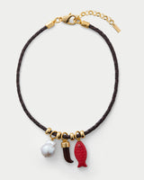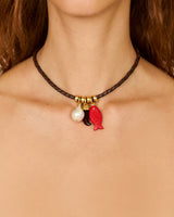 An éliou HQ favorite, our Pesca necklace features a hand carved man-made coral fish pendant, an acrylic saber tooth charm, a baroque freshwater pearl and 18k gold plated rondelles on a braided leather cord. The perfect piece for your next seaside escape and summers to come.
