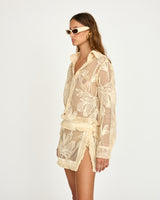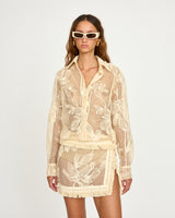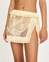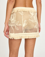 Our Fibi mini skirt features an intricate floral pattern woven into a semi-sheer net embroidered cotton. The elastic waistband provides a comfortable and flattering fit, while delicate fringe accents along the hem add a touch of texture and dimension. The skirt is finished with a slit on one side.