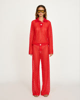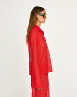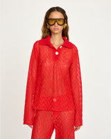 Our Andre Top is an artisanally crafted shirt, hand-cut in Brazil from a semi-sheer bright red fabric and finished with a delicate hand-crocheted collar. With its airy feel and nod to vintage summer essentials, this silhouette has become an Éliou staple- returning season after season.