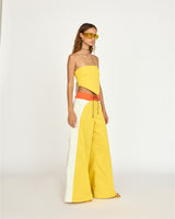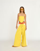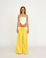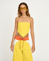 For this collection, we returned to our roots—drawing inspiration from familiar sights, colors, and silhouettes. We wanted the pieces to feel even more connected to the country where they were made. Referencing Rio’s vibrant beach culture, the Brazilia top is a reversible, self-tie strapless top that can be worn on either the yellow or white side.