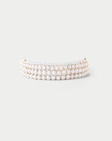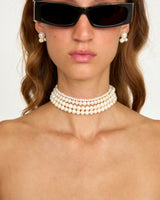 A modern take on a classic. The Camille necklace layers four strands of freshwater pearls in graduated sizes, hand-strung in Miami by our team of female artisans. Wear it with a bare neckline — or something entirely unexpected.
