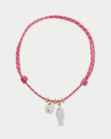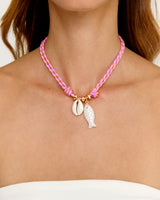 Our Ollie necklace features a hand carved man-made mother of pearl fish pendant, a natural cowrie shell and 18k gold plated rondelles on a paracord necklace. Can be worn long or short depending on where you adjust the paracord necklace.