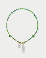 Our Ollie necklace features a hand carved man-made mother of pearl fish pendant, a natural cowrie shell and 18k gold plated rondelles on a paracord necklace. Can be worn long or short depending on where you adjust the paracord necklace.
