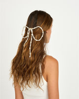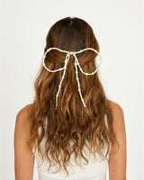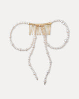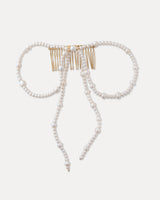Bows have long held a special place in fashion history, often associated with both femininity and grace. Our Genevieve Bow is composed of freshwater pearls, delicately hand wired onto a gold plated barrette. Each bow is thoughtfully produced in our Miami studio, using only natural materials, ensuring that no two pieces are exactly alike.