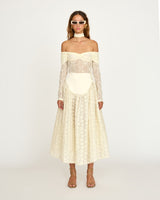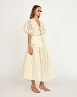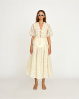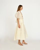 Our introduction to a more formal silhouette, the Keana Skirt is cut from semi-sheer lace with a delicate floral motif. Gathered at the waist, it balances fitted and loose elements to create soft volume and fluid movement. Pair it with a fitted tank or our Manola top for a more whimsical look.