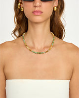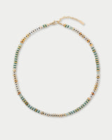 Our Kai Necklace features a beautiful mix of natural gemstones like jade, aventurine, agate, and glass beads, accented with 14k gold-filled beads. With its vibrant design and earthy tones, it adds a pop of color and sophistication to any outfit.