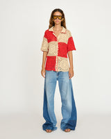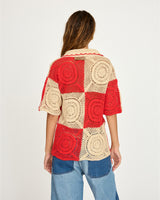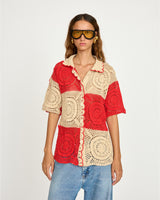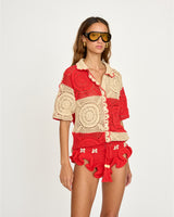 Crocheted in alternating panels of red and natural, the Kaleo Buttondown is a nostalgic nod to the tablecloth that lived on one of our co-founder's grandmother’s kitchen table every summer morning. Featuring intricate hand-crocheted circular motifs and a scalloped button placket, it’s an easy piece to throw on with denim or layer over swimwear.