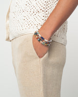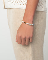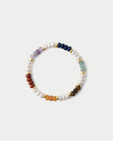 Our Kalid bracelet is an elastic bracelet composed of freshwater pearls, gold plated rondelles, and a mix of Tiger Eye, Aventurine, Amethyst, Lapis, Red Jasper and Yellow Jade chakra beads. Hand strung by our team of female assemblers in Miami and meant to be worn alone or stacked alongside another one of your favorite éliou pieces.