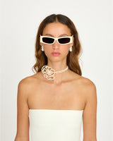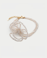 The Laudi Necklace is a hand crafted pearl choker, designed to capture the shape of a blooming flower. The design is arranged by using assorted freshwater pearls, each with subtle differences in shape and sizes. The process of creating this piece is labor-intensive but results is a sophisticated, feminine silhouette that rests gently at the neckline. The three inch extension chain offers the option to wear this piece as a choker or as a longer style necklace.