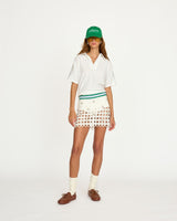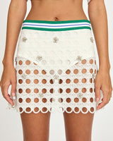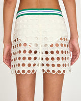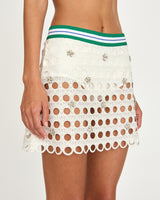 Crafted from lightweight lace, the Sintra mini skirt features an open circle-cutout pattern with hand-sewn floral appliqués. Its elastic waistband with green and blue stripes adds a sporty contrast to the delicate lace, while a built-in undergarment offers comfort and proper coverage.