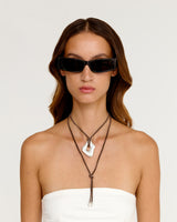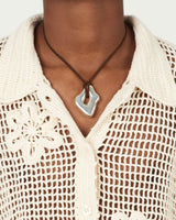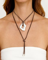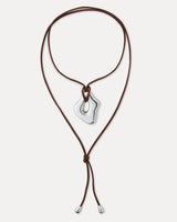 Introducing our Eloise wrap—a lightweight wrap showcasing a brown leather cord paired with a hand-shaped silver pendant and end caps. This versatile necklace allows you to wrap and style it as you choose, providing endless possibilities for personal expression.