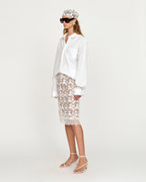 The Marcela Midi Skirt is a semi-sheer sequin piece. The skirt delicately falls just below the kneecap and features an elastic waistband with a drawstring for an adjustable fit.