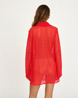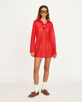 Our Migge Dress is an artisanally crafted micro dress, hand cut in Brazil from a semi-sheer bright red fabric and finished with a hand-crocheted collar. The subtle sheerness and nostalgic silhouette were originally made as a one-off piece for one of our co-founders to travel with on a summer trip to the Amalfi Coast two years ago. It only felt right to bring it back for this high-summer collection- so you, too, can make memories in it, wherever you're headed next.