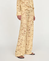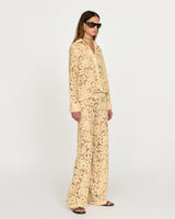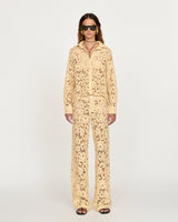 The Rafa Pant is crafted from 100% cotton lace with a soft, open floral pattern. The fabric has a weighted, vintage-inspired feel that drapes easily while holding its shape. Mid-rise with a relaxed, wide-leg fit, it pairs seamlessly with the Gabriel Top for a complete look. Styled here with skin-toned undergarments for a clean, continuous finish.