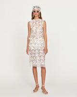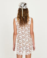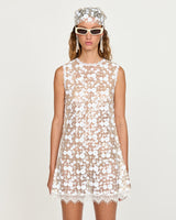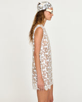 Our best-selling Strela Micro Dress features a classic A-line silhouette and high neckline. Crafted from floral lace, the semi-sheer fabric catches light in motion.The shorter hemline is edged with scalloped lace. Styled here with skin-toned undergarments for a clean, continuous look.